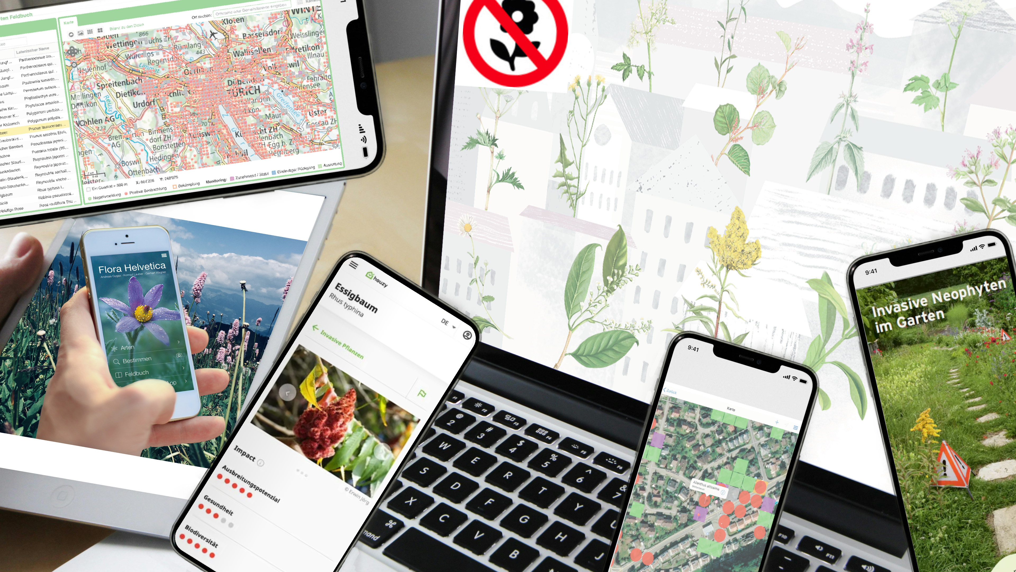 Mit der kostenlosen InvasivApp von InfoFlora lassen sich invasive Pflanzenarten direkt vor Ort bestimmen, melden und kartieren. Gemeinden, Fachpersonen und Privatpersonen erhalten so ein praktisches Werkzeug, um die Verbreitung invasiver Arten im Blick zu behalten und Massnahmen einzuleiten.