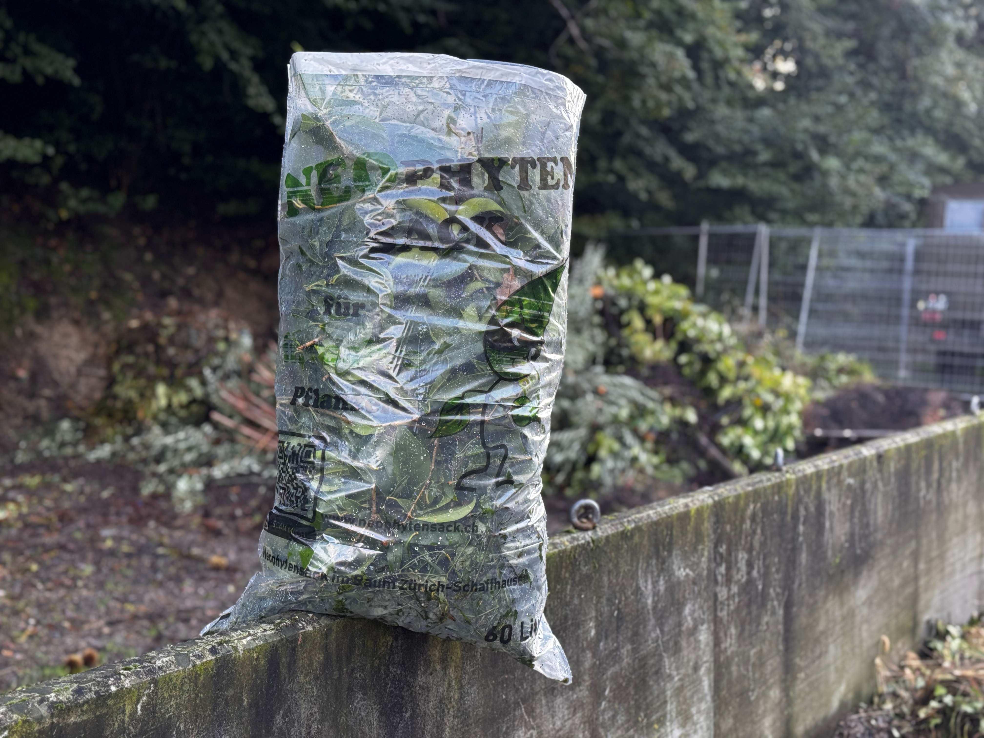 Der Neophytensack sieht aus wie ein stabiler Kehrichtsack, erfüllt aber eine besondere Funktion: Er ist ausschliesslich für invasive Pflanzenabfälle bestimmt. Alles, was darin landet – Triebe, Samen oder Wurzelstücke – wird mit dem Kehricht in der Verbrennungsanlage restlos zerstört. Damit ist garantiert, dass invasive Neophyten keine zweite Chance bekommen.