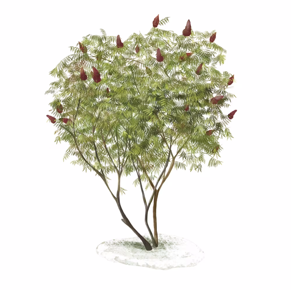 Der aus Nordamerika stammende Essigbaum (Rhus typhina)wird 5–8 m hoch. Junge Triebe sind filzig behaart, die gefiederten Blätter bis 50 cm lang und im Herbst leuchtend rotgelb. Auffällig sind die roten Fruchtkolben. Er ist zweihäusig, lichtliebend, anspruchslos und breitet sich vor allem über Wurzelschösslinge aus, wodurch er grosse, dichte Bestände bilden kann.